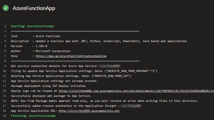 Lastly, the AzureFunctionApp@ task comes with a handy appSettings parameter, where you can parse in your Application settings as a string of key-values. Unfortunately the az functionapp deployment source config-zip CLI command does not accept this parameter, so you will have to update your Function App app-settings using a separate command. See below: