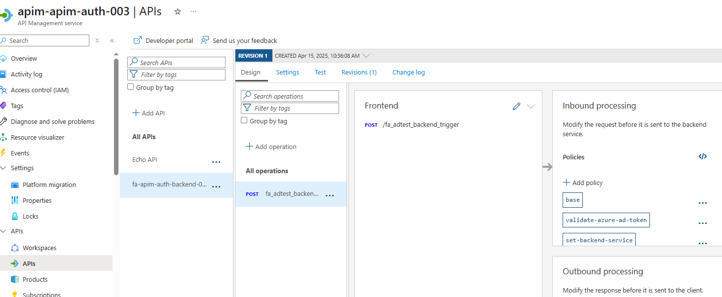 - In APIM, you should see our Function App Backend API, with all the backend config, named values and policies configured to allow this auth process to work: