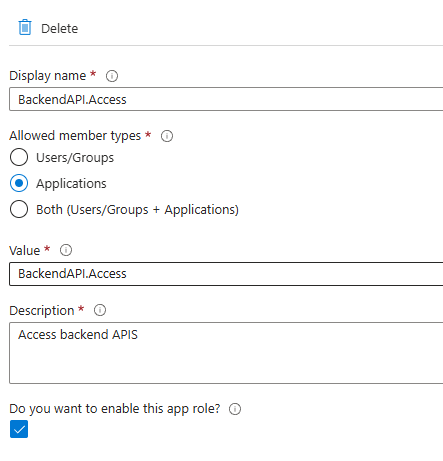 - Creating App Roles: First, we define roles in our backend API’s app registration. I’ve started with a simple read-only role, but you can expand this based on your needs.