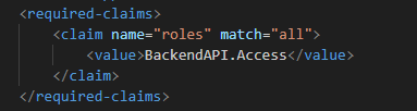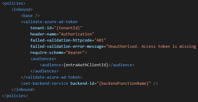 - Validation in APIM: Finally, we validate these roles in our APIM policies. This ensures that every request not only comes from an authenticated source but also has the right permissions. An example policy segment is below: