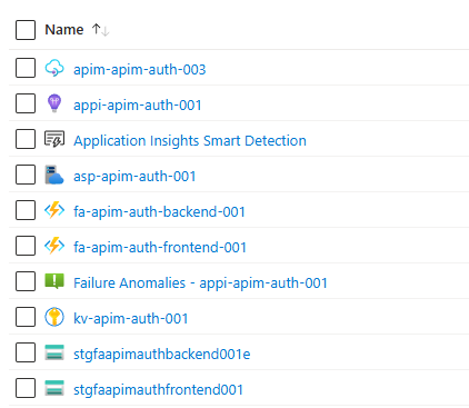 - The following Azure resources, including an API Management instance, backend and frontend function apps, key vault, app insights and others.
