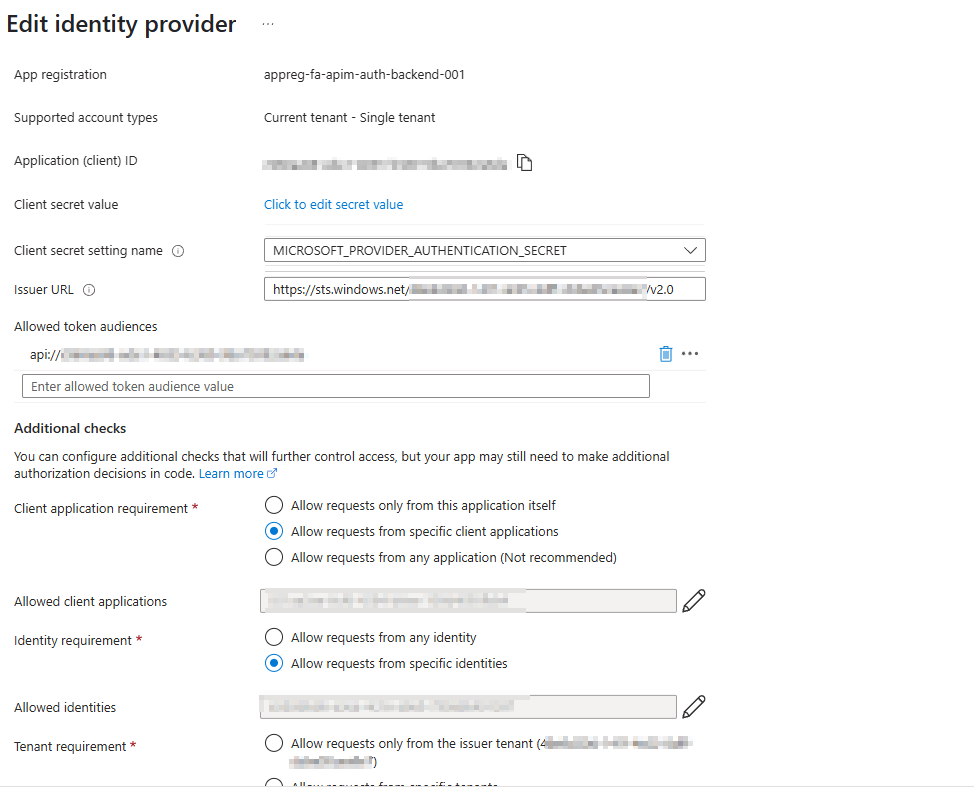 The request to the backend server is authenticated using Microsoft Entra authentication. The authentication is configured to only allow requests from:- My specific Entra Tenant