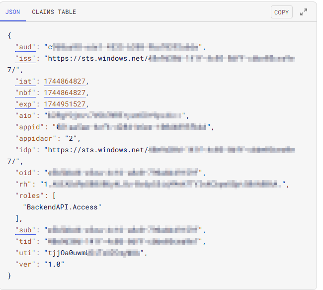 | iss | The issuer of the JWT. | In our case it is the Entra sts.windows.net provider with our Entra tenant-id. |